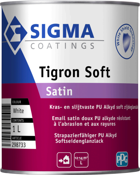 Sigma Tigron Soft Satin Kleurentester is een watergedragen, sneldrogende muurverf in een handig 250 ml testformaat om kleuren op de muur uit te proberen. De tester is in alle kleurwaaiers op te kleuren, zoals NCS, RAL en Voice of Colour. Het product is een zachte, zijdeglanzende, kras- en slijtvaste solventgedragen lak voor binnen en buiten op basis van polyurethaan-alkyd met White Shield Technology.